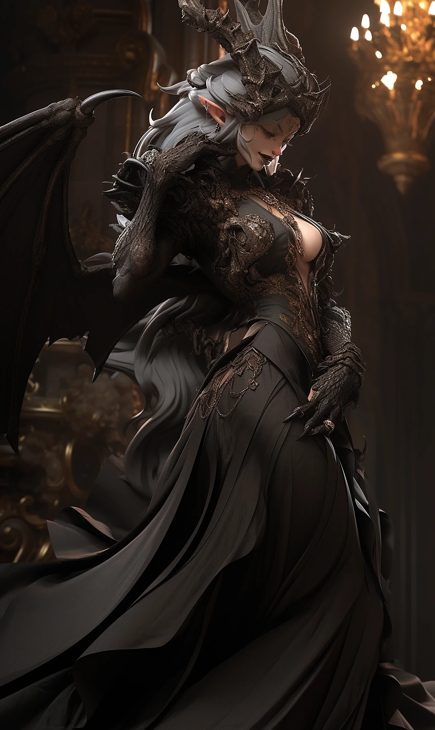 a anthropomorphic furry dragoness, villainess queen, intricate luxury attire, wags her hips in the crystal hall, composition evoke a sense of admiration, dark and brooding designer daz3d, strong sense of realism, dark kingcore, realistic and detailed, emotional, epic dramatic lighting, 32k UHD resolution --style expressive --ar 3:5 --upanime --niji 5 --q 3
