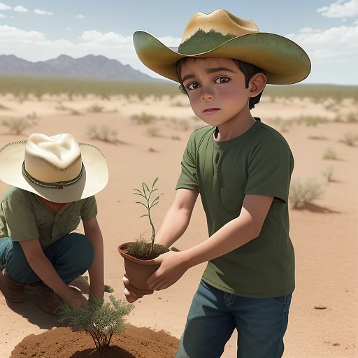 Photo of a ultra realistic of a boy in green shirt and cowboy hat, planting an acacia tree in the chihuahua desert, with dune foothills