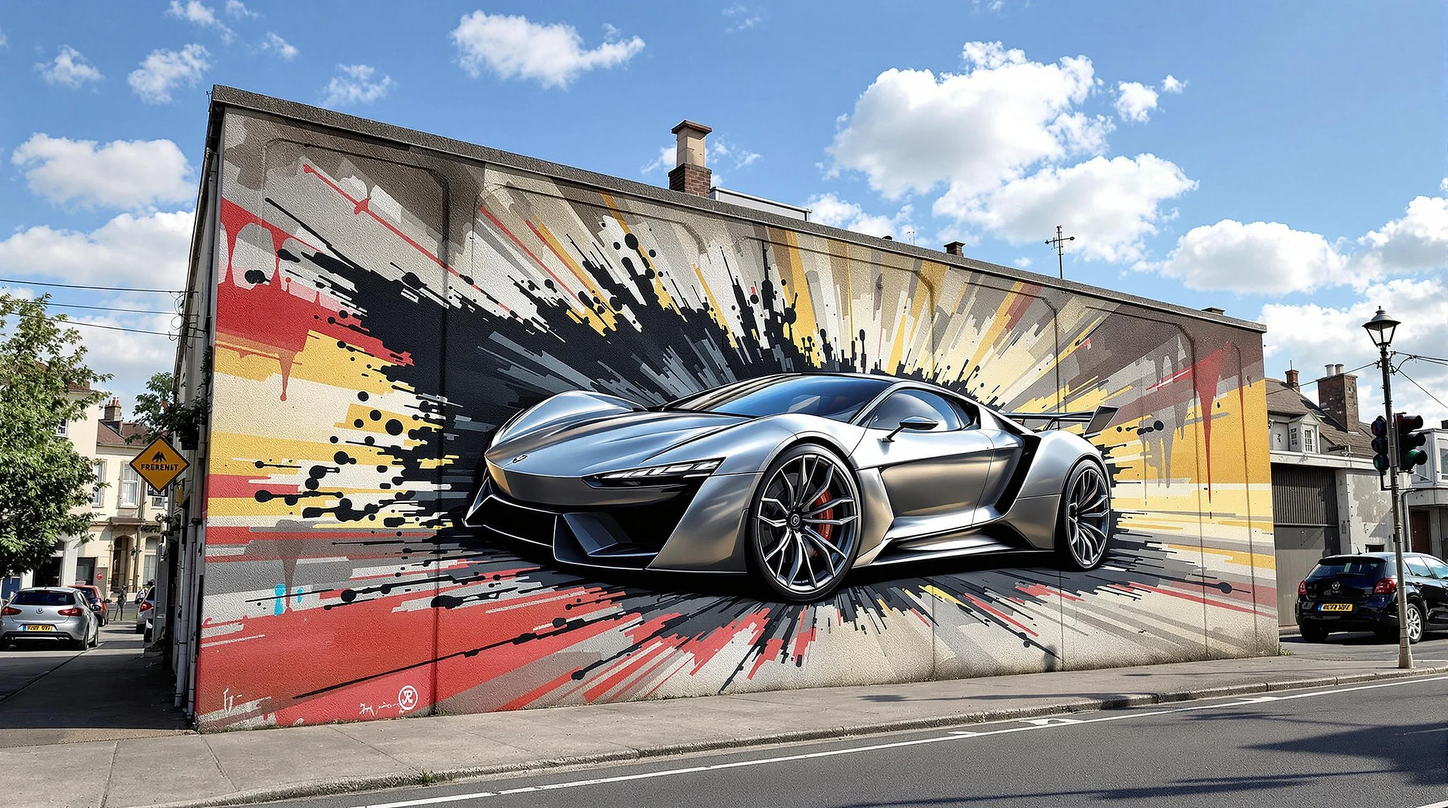Image showcases a painting on a building , featuring a 3D graphiti art scenery depicting a sports concept car, with a modern art design. The car is emerging from the wall, blending seamlessly with the surrounding urbain environment. The car's sleek, metallic body and glossy black accents seem to merge with the wall's texture, creating a stunning visual effect. The wall's colors and patterns subtly reflect the car's aerodynamic design, adding to the illusion of emergence. The surrounding environment, with urbain structures provides a serene backdrop, while the clear sky with scattered clouds hints at a bright, sunny day.