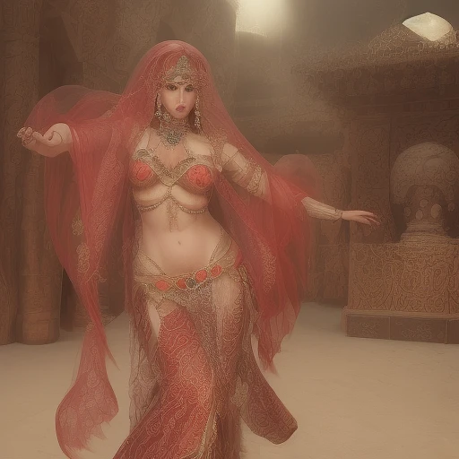 *Description* A breathtakingly detailed, hyper-realistic depiction of a gorgeous woman in a stunning red belly dancing outfit, adorned with intricate gold jewelry and a majestic forehead piece, and accentuate her beauty, her stomach is taut and chiseled, standing seductively in a serene desert temple dance pit with ornate pillars. *Character Details* - Exquisite, photorealistic face with precise cosmetic features -Stunning, detailed eyes sparkling with vitality - Full, luscious lips - Flawless, radiant skin - lithe, taut chiseled stomach, DD breasts, accentuated by the fitted top and bottom. - waist length luscious, dark hair cascades beautifully around her. - wears a matching red skirt and bra, exuding an air of exotic elegance, both are adorned with gold accents, golden embroidery and green gemstones. - The skirt is split at the front, revealing her leg, is adorned with gold accents, gold embroidery, and green gemstones. *Attire and Accessories* - Gold jewelry, gold chains, wrist cuffs, upper arm coifs, belly button adornment, thigh bands, ankle cuffs, forehead piece and a gold band encircling her neck add a touch of luxury, elegance, beauty and mystery. - Intricate embroidery and patterns decorate the outfit along with green gemstones *Environment* - golden sunlight lighting creates an enchanting ambiance. - Fantasy desert temple background with ornate pillars, sand dance pit, ethereal, swirling clouds - Dramatic, cinematic lighting with soft, golden hues - Wide-angle perspective, emphasizing grandeur *Overall Mood* - The woman's pose and attire evoke a sense of mystery and allure. - Her confident stance suggests she is about to perform a mesmerizing dance. *Rendering Details* - 8K resolution with sharp focus - Hyper-realistic rendering with extreme details - Photorealistic textures and shading - Cinematic, high-contrast lighting