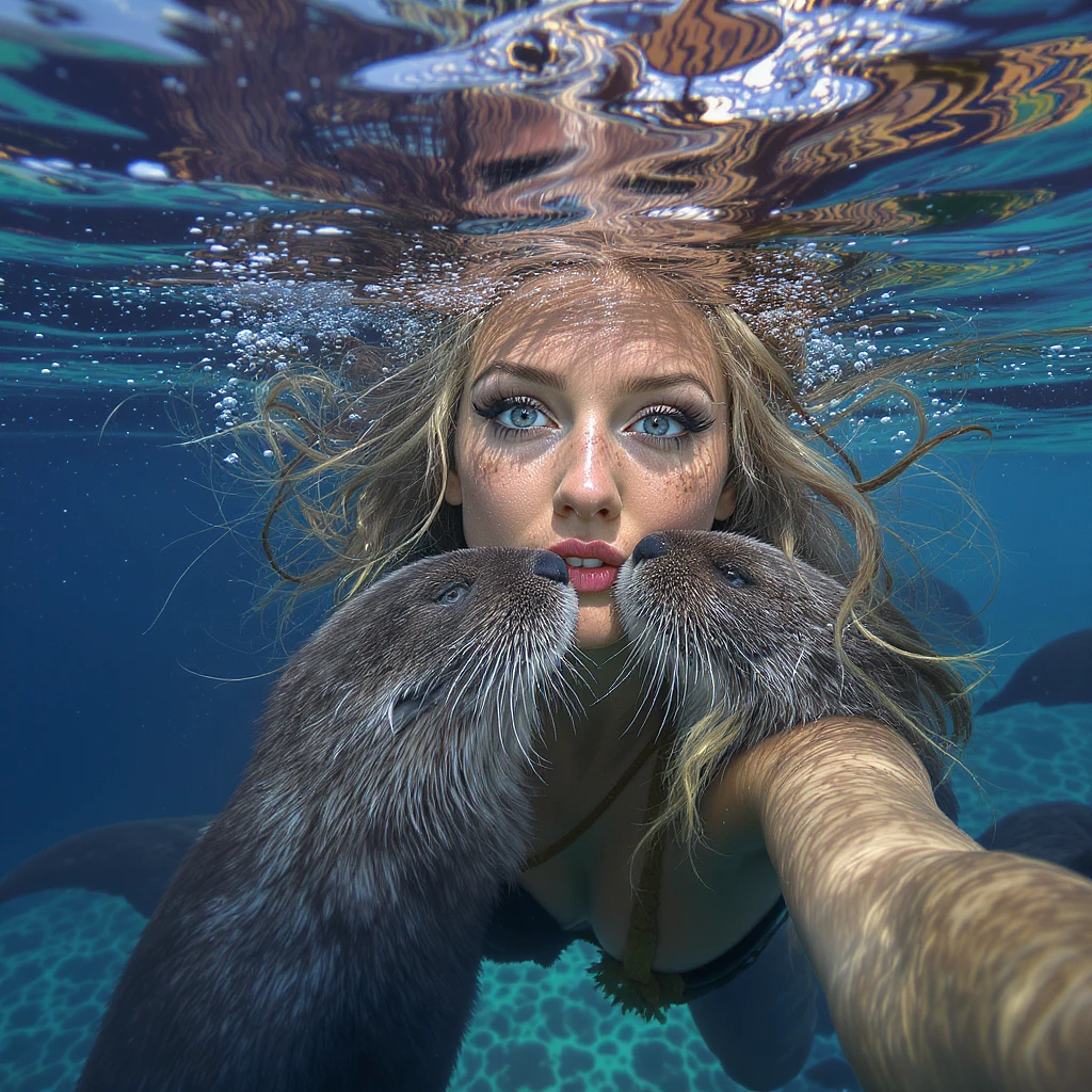 Incredibly beautiful Norwegian with blue eyes, long eyelashes, black eyeliner, freckles. Dressed in a prehistoric skirt, extremely strong body, she swims with otters, one of them kisses her on the face, incredible atmosphere and tranquility, clear details, perfect image, Full body, full realism, clear details, perfect image.