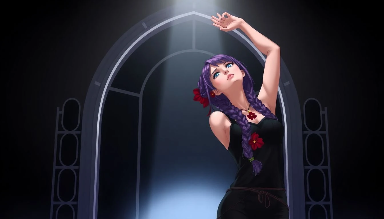 a digital illustration of a woman with long, braided purple hair, tied up with ropes and red flowers. The woman is standing in front of a large arched window, with her head tilted back and her hands raised above her head. She is wearing a black leather outfit with red flowers attached to it, and her hair is braided and tied with a red flower. The background is a large arched window with a white frame, and the lighting is dim, with a spotlight shining down on the woman. The overall style of the image is dark and moody, with a focus on the woman's pose and the use of shadows to create a sense of drama.