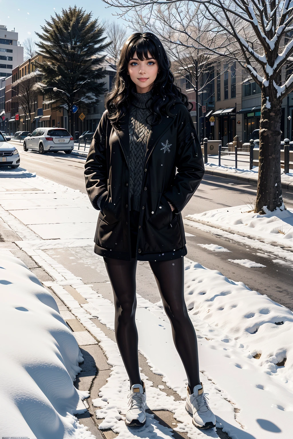 (8k,ultra hd,high resolution,extreme detail,octane,render,best quality,masterpiece,dynamic angle, highest detailed:1.2) , (3/4 shot,photo of a female:1.2) , (long wavy black hair,bangs:1.5) , (blonde hair tips:1.2) , (long sweater:1.4) , (black pantyhose:1.3) , (black long winter coat:1.3) , (hands in pockets:1.3) , (ultra high resolution textures:1.2) , bokeh, radiant skin, snowing, city background, (official art:1.2) , kodak, trending on facebook