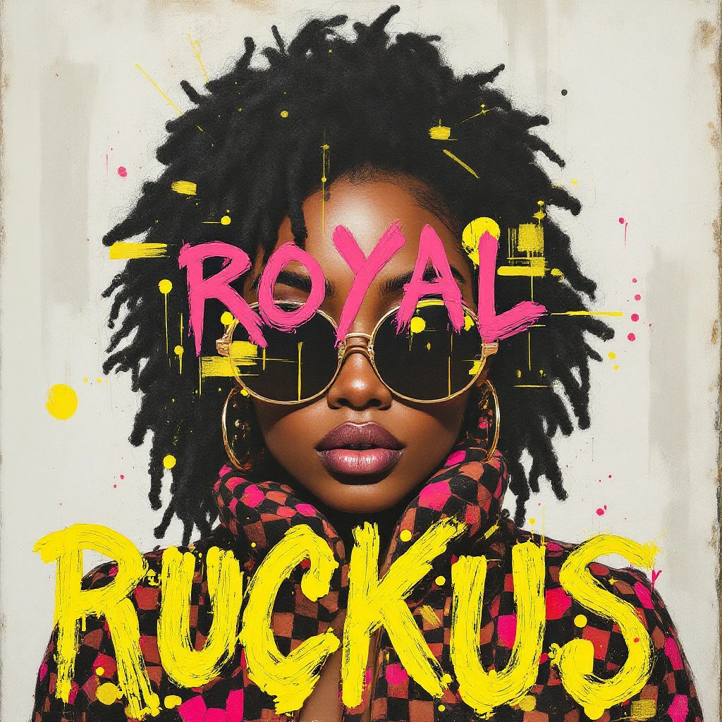 A baroque portrait painting of a beautiful dark skinned black woman wearing sunglasses, bright yellow graffiti over it, tagging-like marks, pink graffiti text that says "ROYAL RUCKUS" made of all of the above, dark academia