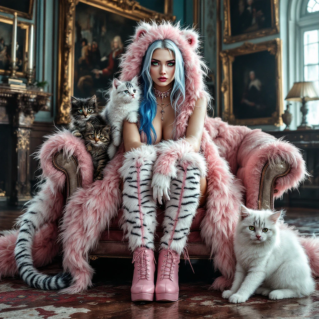 Evergarden, full body open furry costume with feet, girl with kittens and ponytail, tiger eyes, extra long blue hair, Ariana, She wears (((Pink) )) knee-high high heel platform boots. Stiletto heel. White-black tiger print color to show. Clothes like full body open dresses. She also has bright green eyes. The setting is an old mansion, with old paintings, northern lights, She has platinum hair.
