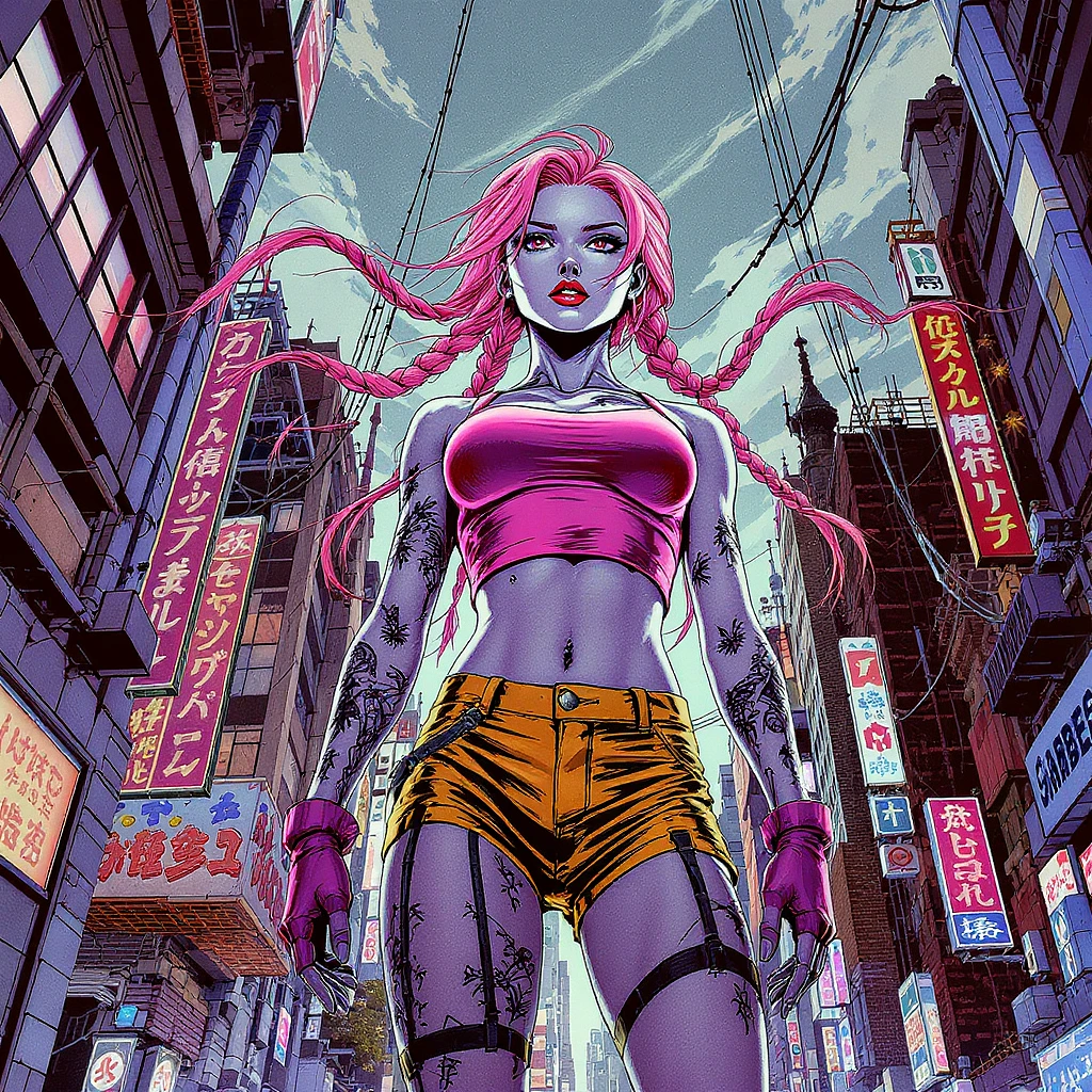 Realistic comic book illustration of young beauty European girl with pink hair with two braids standing in the middle of a city, low angle viev, color tattoos, ultra-short pink top tank, ultra-short yellow shorts, pink fingerless gloves, comic book cover, dynamic art, action pose, black outline, comic style, sci-fi, mechanized precision, meticulous detail, by Travis Charest style, by Frank Cho style --ar 4:5 --s 450 --v 6. 0