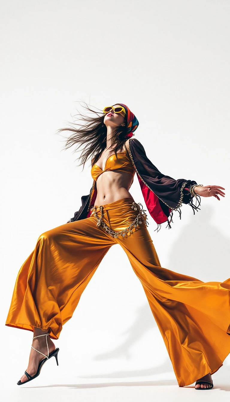 Bold Silhouette Against White: A fashion editorial photography piece captures a tall, sexy, beautiful female college model against a bright, plain white background. She is dressed in a shiny, vibrant avant-garde street ensemble blending 60s go-go dancer and bohemian themes, with her windswept long hair styled in a bohemian style and with a colorful boho wrap headband. She is wearing bold, Willy Wonka style sunglasses and a revealing, loose top that shows her midriff. The pose is a dynamic and artistic and energetic movement caught mid-air in a wide striding movement with confidence, taking a single step forward and with one leg kicked back and with her head thrown back in a gesture of freedom. The view is a low-angle, full-length shot with exaggerated surrealistic wide angle distortions, highlighting her powerful silhouette and strong movement.