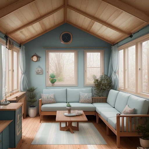 High resolution photography tiny home interior design, dreamy sunken living room conversation pit, wooden floor, small windows opening onto the garden, bauhaus furniture and decoration, high ceiling, beige blue salmon pastel palette, interior design magazine, cozy atmosphere; 8k, intricate detail, photorealistic, realistic light, wide angle, kinkfolk photography, A+D architecture