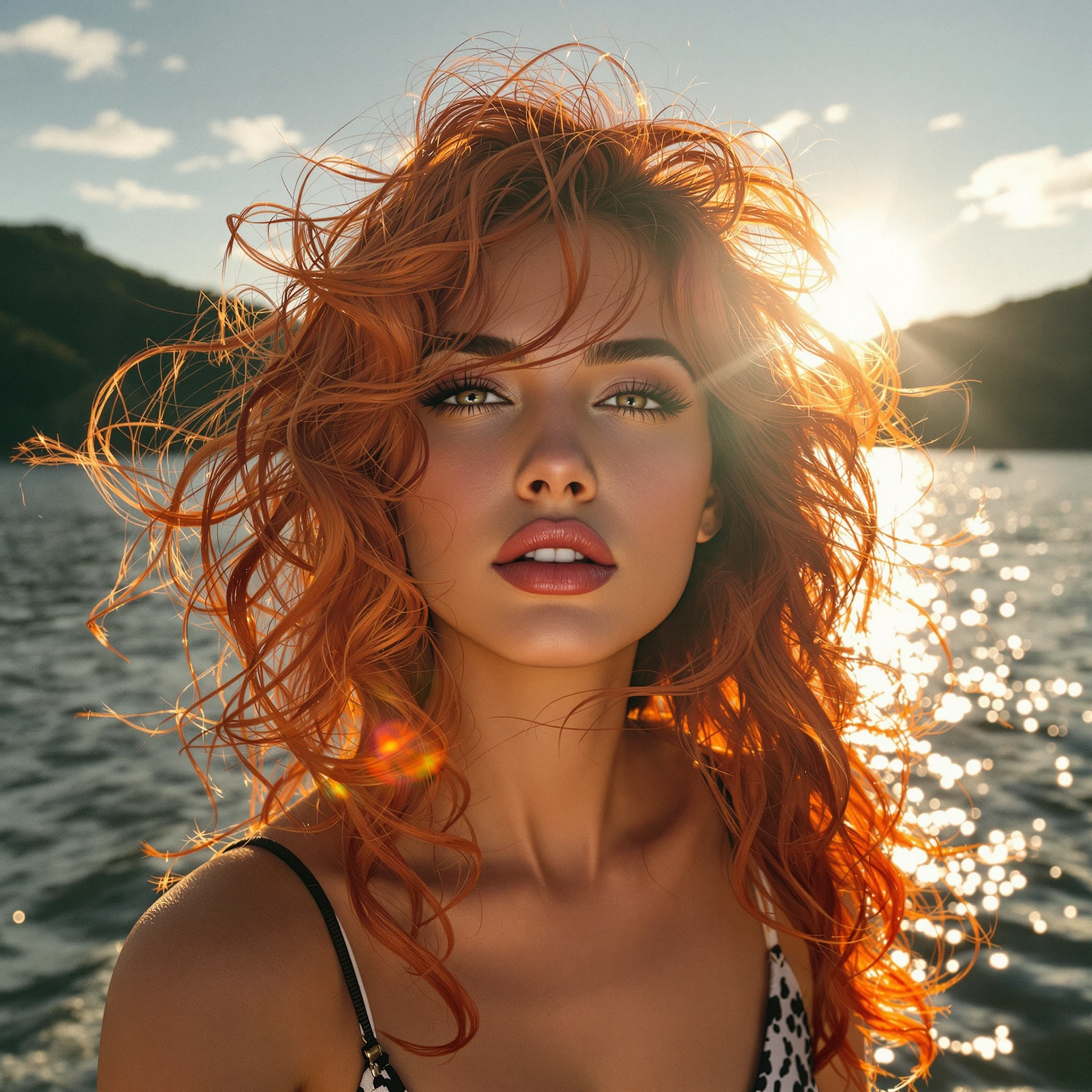 Un rostro de una hermosa mujer rubia, de 20 años, cabello grueso y completamente rubio con el efecto de la fuerte luz del sol iluminando el cabello, Maravillosa puesta de sol sobre un lago, pequeñas ondas en el agua, día brillante,