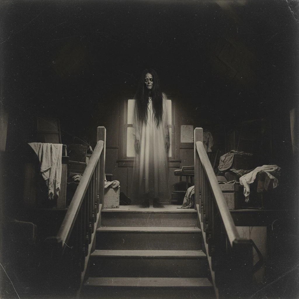 Natural candid photograph of a creepy ghostly kuntilanak, sadako resembling a Southeast Asian folklore spirit (kuntilanak) barely visible and almost swallowed by darkness in the attic of an old wooden house. Captured from the bottom of the staircase leading up to the attic. Taken with a vintage bulb e camera — low resolution, slightly blurry, eerie atmosphere, dim lighting, deep shadows, very faint apparition blending into the dark, her face is old zombie like, setting 1903