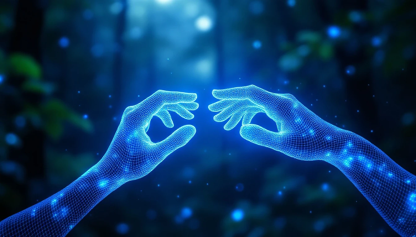 A digital 4K image of two ethereal glowing blue hands reaching towards each other in a mystical forest setting. The hands are rendered in a wireframe mesh style with a luminous blue glow, creating a holographic effect. The hands are positioned symmetrically in the center of the frame, with palms facing each other and fingers spread in an open gesture. The background features a dark forest environment with blurred green foliage and bokeh lighting effects creating a dreamy atmosphere. The overall color palette consists of deep blues, forest greens, and dark shadows, creating a magical and otherworldly ambiance. The hands cast a soft blue glow on the surrounding environment, emphasizing their supernatural nature.