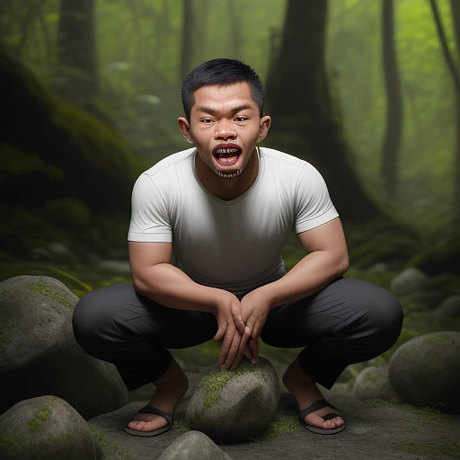 an Indonesian guy, opened his mouth as wide as possible, until his teeth were visible, the guy put one hand on his forehead like he was respectful, his expression was looking around looking for something, looking around, the guy's mouth was very wide, the guy was squatting on a rock, with the background a very fresh and natural forest, hyper realistic, no defects.