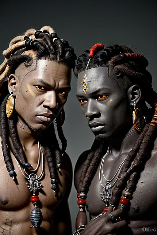Two male voodoo priests, dark complexion, up close to face and chest, sea shells and nails jewelry, dark gray skin, rustic background, yellowish eyes, jewelry in dreadlocks, light gray and faded red colors in scene behind them, finely detailed, intricate design, facing camera, ultra rendering, quality rendering, photographic lighting, cinematic, octane rendering