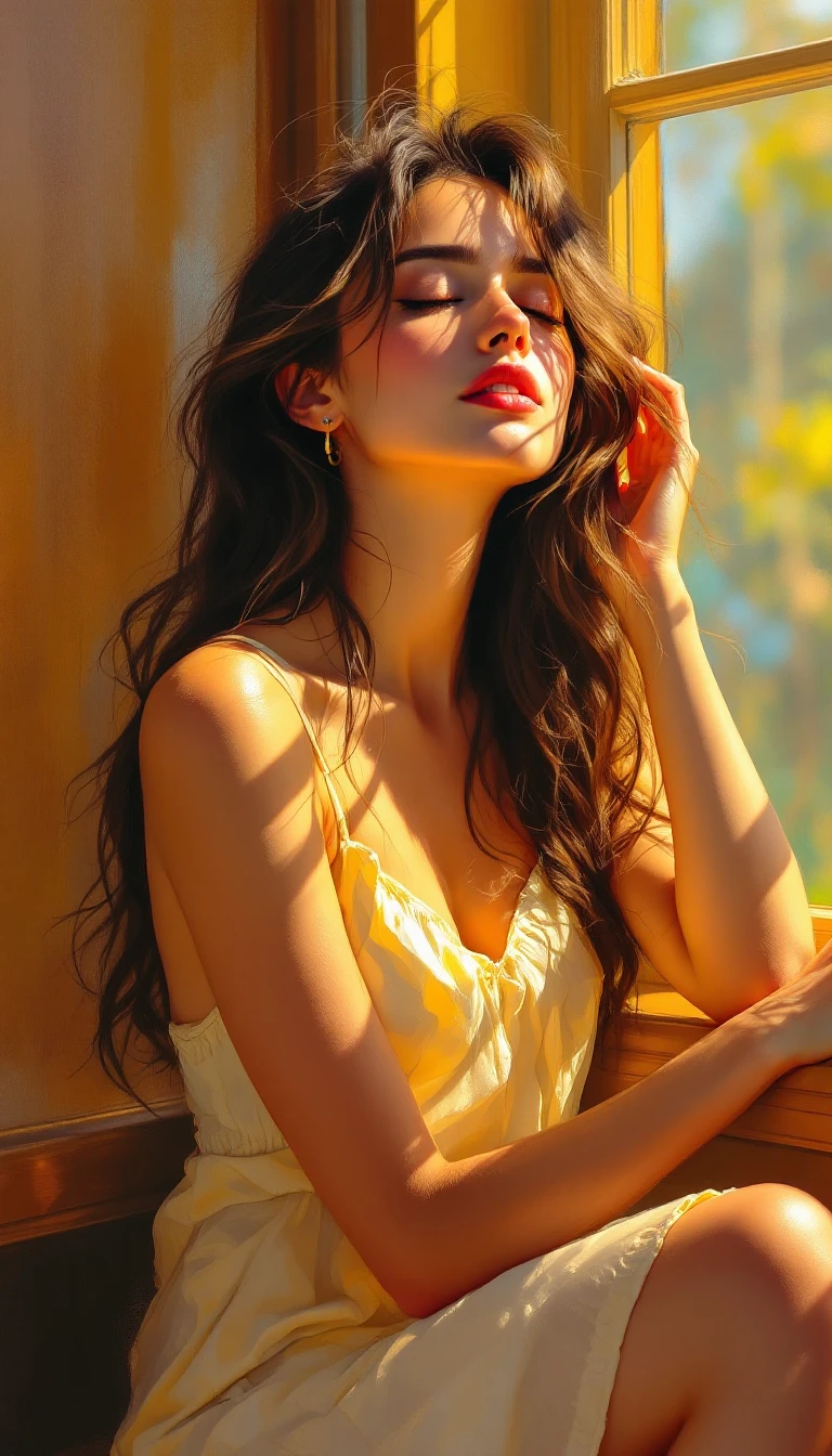 An expressive, oil-painting-style portrait of a beautiful young woman sitting peacefully by a sunlit window. She has sun-kissed skin and long, tousled brunette hair that glows in the golden light.