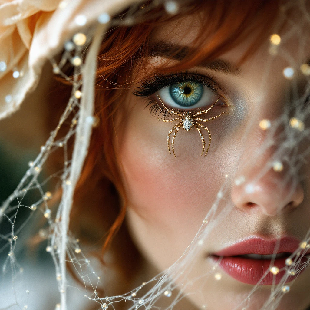 Close-up of a beautiful red-haired woman, wearing an elegant hat with a stunning spider brooch, a delicate web-like veil partially covering her face, rendered in a mixed style of impasto for textured brushstrokes, 3D CGI for depth, and high-relief effects for the brooch and veil, inspired by John Singer Sargent's portrait techniques, with dramatic lighting, vibrant colors, and a cinematic composition. " Let me know if you'd like help refining it further! Would you like me to generate an image based on this description? Please confirm if you'd like me to proceed.