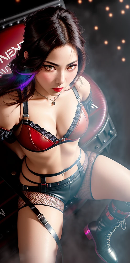 Beautiful k-pop rockstar lying on a stage floor during a massive concert,