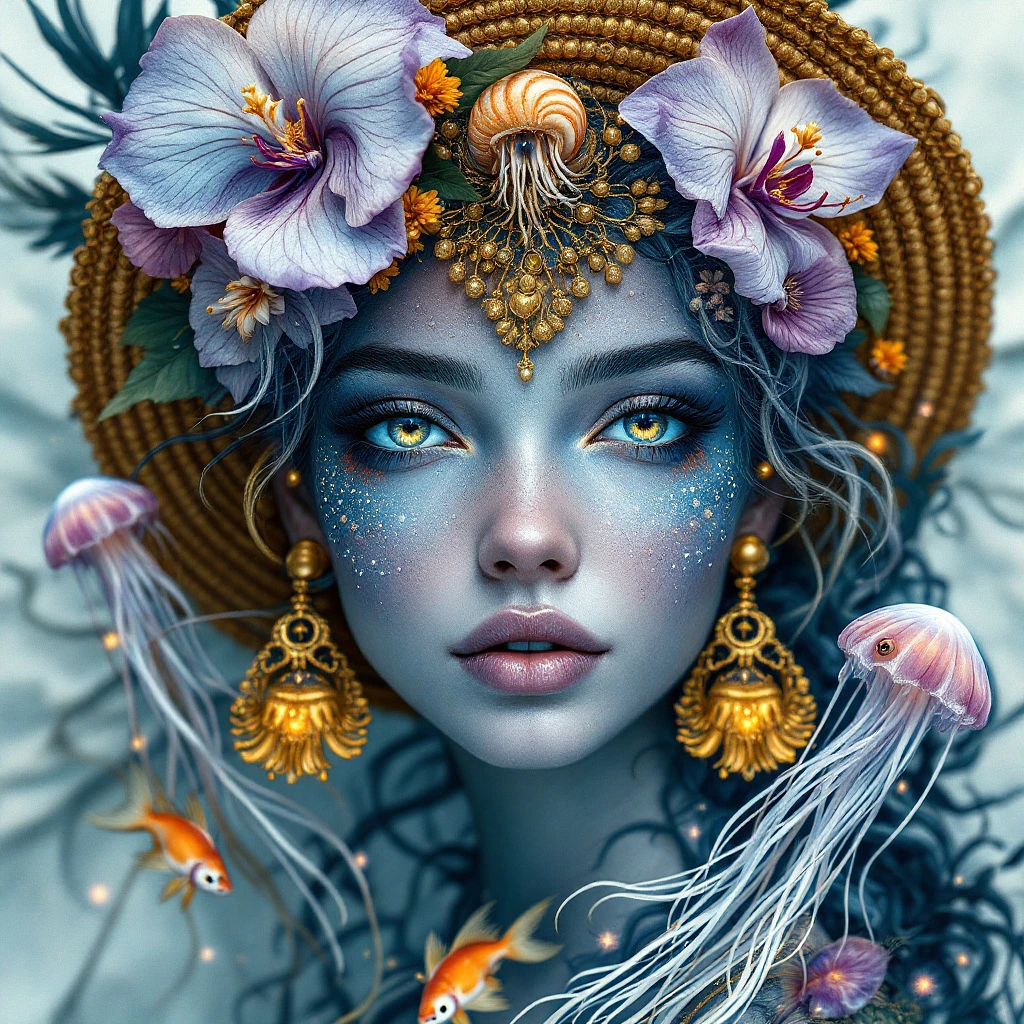In pen and ink, a close-up portrait of an angel-winged Goddess with gold earrings and a Summer hat, jellyfish, Goddess head, nautilus, orchid, exotic fish, and bioluminescent creatures, intricate. Octane render, trending on ArtStation, symmetrical artwork, cinematic, hyper-realism, high detail, octane render, 8k.