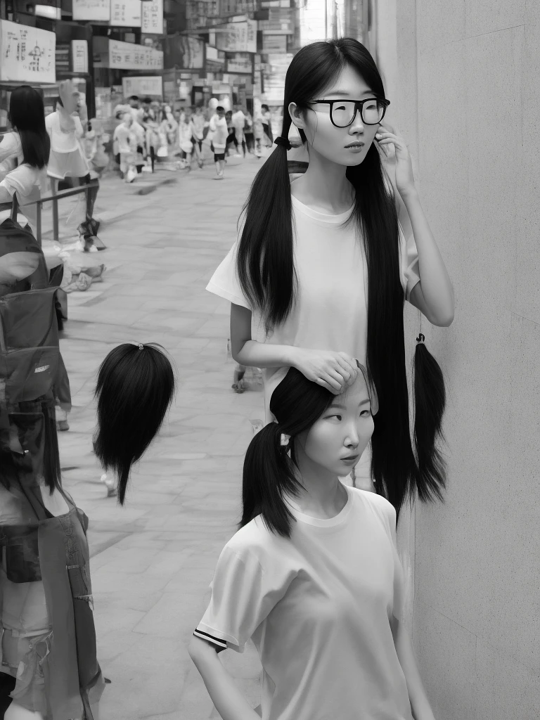 photography, side view, upper-body, portray an innocent professional korean woman model standing against a seoul big wide street, many crowd, gaze, giving off an aura of wisdom and experience, she’s clad in a monochromatic black loose-fit T-shirt, black shoulder bag, shes hair is tidy pony tail, complemented by silver frame glasses, and bold and confident pose, presenting a portrait of aged grace and urban fashion vibe, urbanism, realistic sun light and shadows, photorealism, UHD --ar 9:16 --style raw --stylize 700