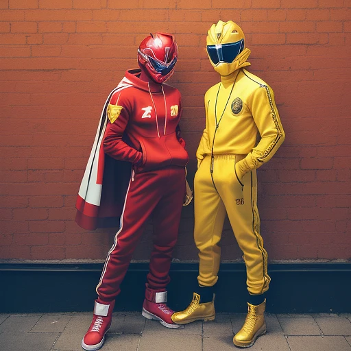 A blackman, with a red power ranger like helmet, in a red track suit with a gold chain that HAS THE LETTER Z and yellow timberland boots, with a yellow cape, holding two spray cans standing in front a red brick wall.