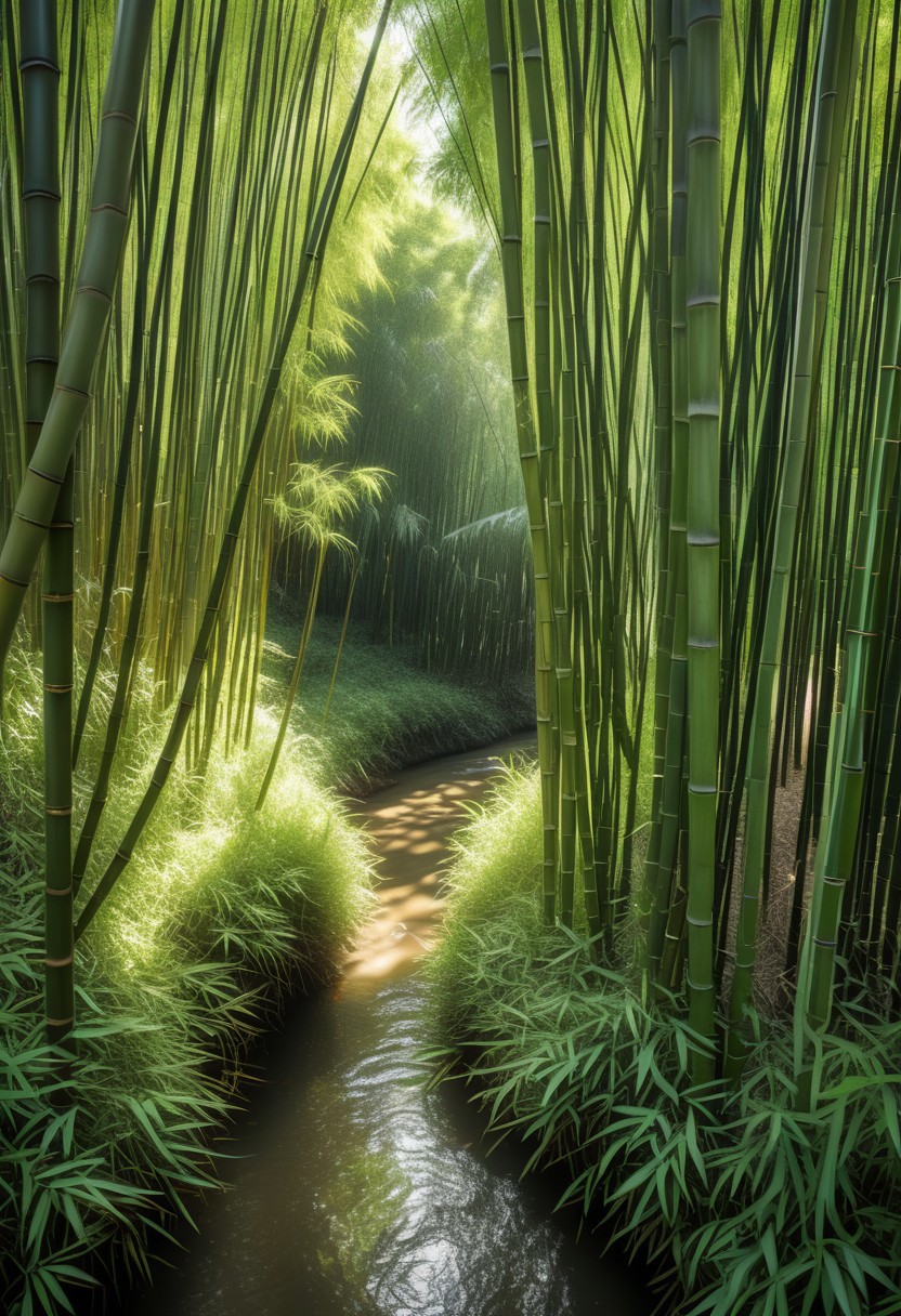 A dense bamboo forest with tall, swaying bamboo canes and hidden paths winding through the thick undergrowth at mid-day. The sun filters through the bamboo in dappled patterns while a small river flows nearby, reflecting the vibrant green of the surrounding trees. High angle shot capturing both the intricate details and the overall atmosphere of the place.