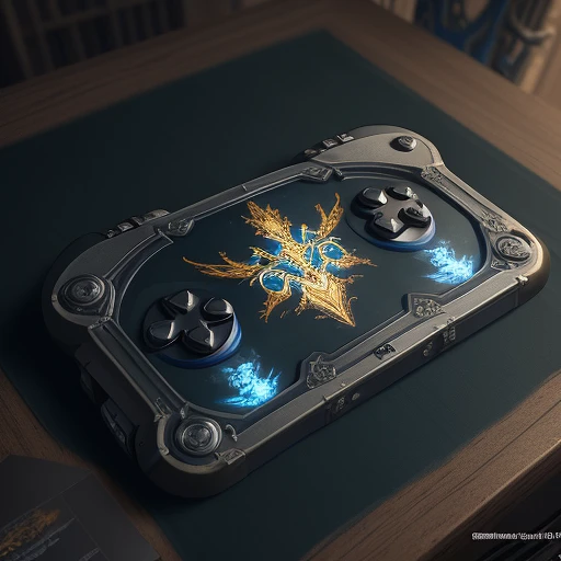 Gamepad on the table with the design and character of Groot The gamepad is gold and blue dark, no watermark, no copyright, high gloss, highly detailed, intricate, silver scrollwork, unreal engine 5, octane render, lumen reflections, quixel megascan, 8k, studio lighting, —ar 1080:1920