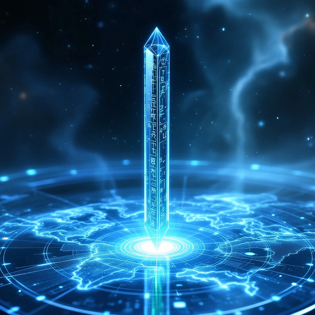 A sleek and futuristic energy detection device, shaped like an elongated crystal wand with glowing blue and green runes etched along its surface. It hovers above a shimmering holographic map, emitting soft pulses of light as it scans the terrain. The background features a galactic expanse with swirling nebulae and faint energy streams