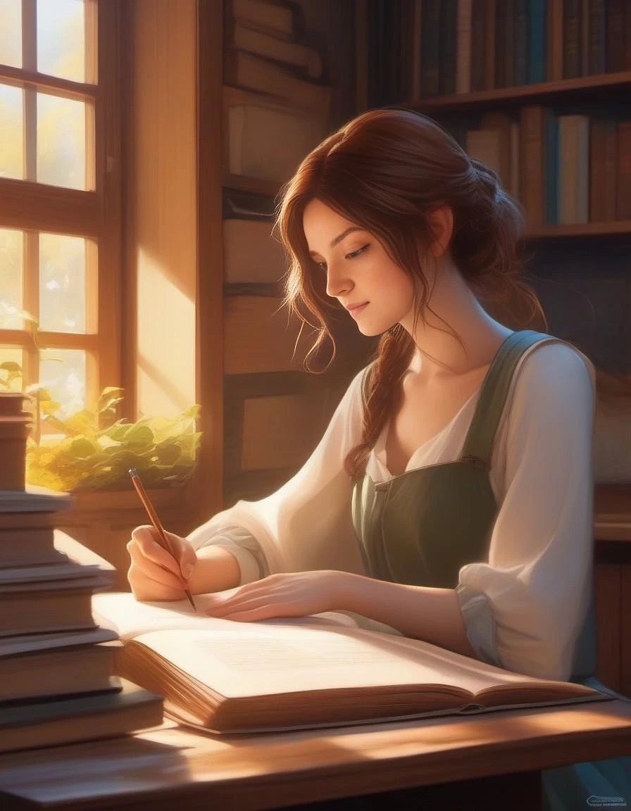 1girl, masterpiece painting of a girl studying, wooden table, open book, wooden walls and furniture, window shows bright moon, comfy house outfit, home, indoors, light brown hair, 3 am, anime, anime face, art by artgerm and greg rutkowski and alphonse mucha, 8k, artgerm anime, professionally color graded, depth of field, hdr