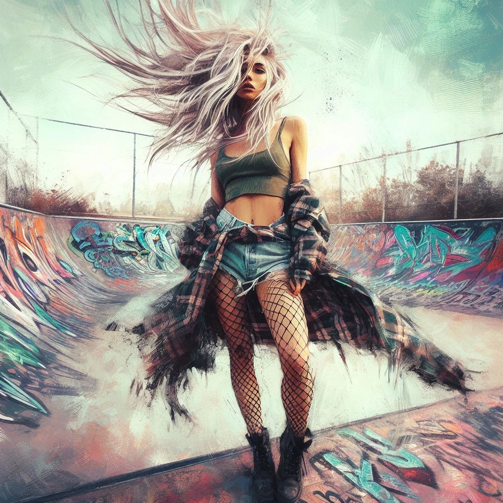 painterly style, , Slim and svelte woman with a slender waist and hips, posing with hands in pockets for a casual stance, messy hair, long white hair flying in the air, wind blowing, thin, pretty eyes, Oversized flannel shirt, ripped fishnet stockings, combat boots. Graffiti-covered urban skate parks . dynamic angle, intricate details, multicolor explosion, blur effect, sharp focus, uhd, colorful shot\n\nmodifier=CarnageStyle, color=blood_red, intensity=1. 6, add lace