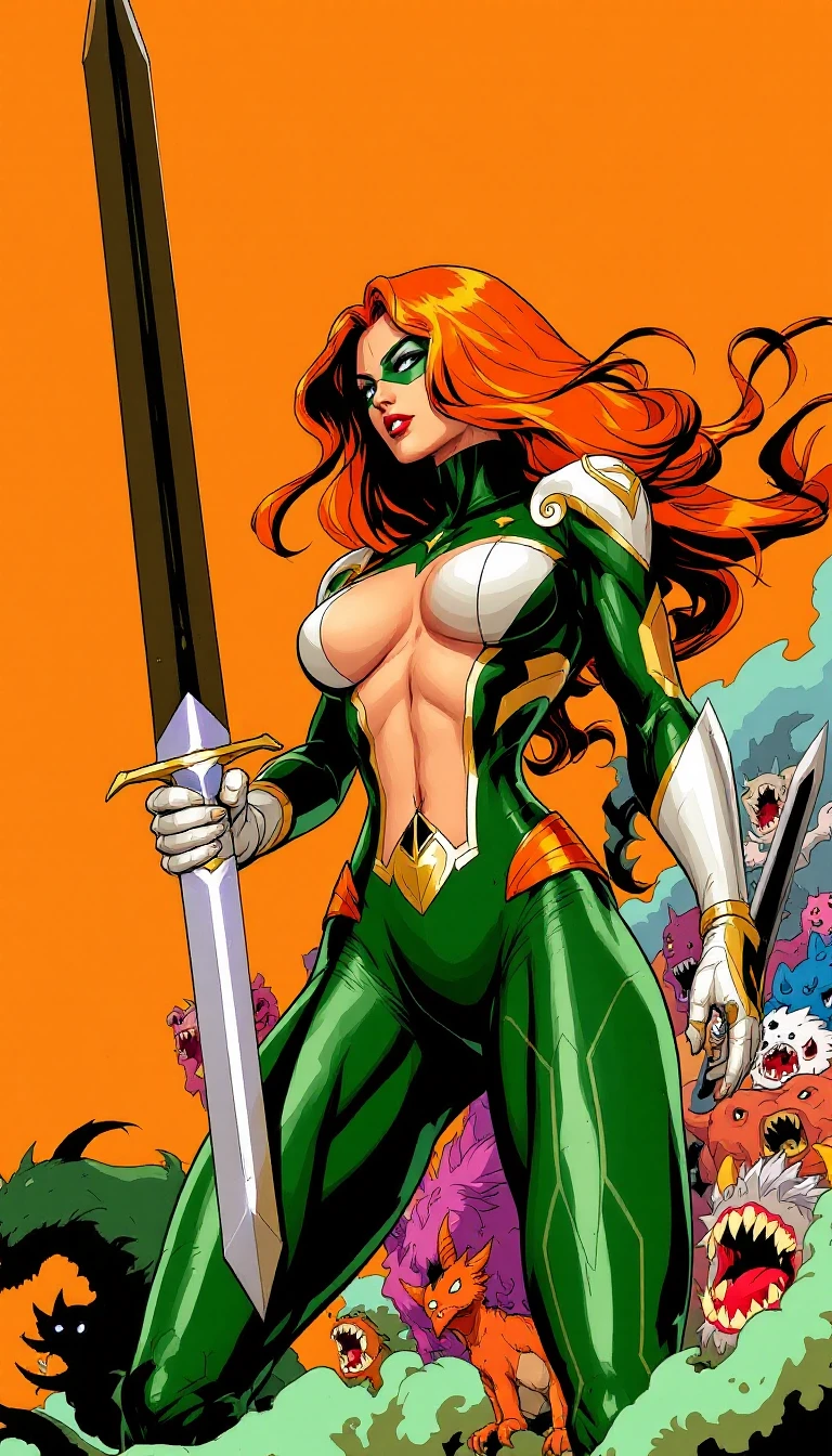 The image is an illustration of a female superhero with long orange hair. She is wearing a green and white outfit with gold accents and is holding a large sword in her right hand. The sword has a pointed tip and a sharp blade. The background is orange and there are several monsters and creatures scattered around her. The overall style of the illustration is bold and striking.