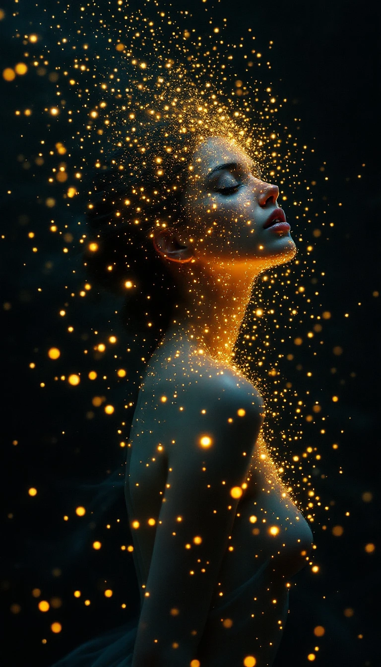 29. An ethereal, three-quarter portrait of a woman, her body seemingly dissolving into a cloud of glowing fireflies, each one a tiny point of light illuminating the surrounding darkness, creating an image of fleeting beauty and ephemeral transformation, while blending organic forms with ethereal qualities of light and shadow.