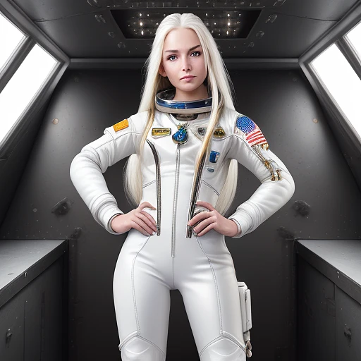 sfw, best quality, ultra high res, ultra-detailed face and eyes, detailed body, detailed clothes, detailed boots, a full body photography of female astronaut, narrow waist, long white hair, icy eyes, white leather jacket, white leather pants, standing inside an Anvil Carrack, professional light, (light on the face)