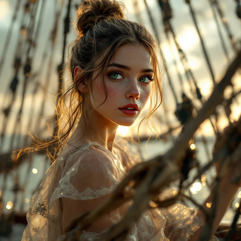 Photo of a ultra realistic sailing ship, dramatic light, A girl who's body is turning transparent and fading from sight, stands at just 4'8" with a delicate, petite frame. She has long, wavy light brown hair that falls to the middle of her back, often worn in a messy bun or ponytail. Striking green eyes are framed by long lashes and thick brows. Skin is fair and dotted with faint freckles across the bridge of her nose and cheeks. Facial features are soft and feminine, with full lips and a button nose, giving her a youthful and innocent appearance. She tends to dress in simple, loose, transparent clothing in muted tones, favoring a light, comfortable style and blending into the background rather than standing out. special visual affects, body is becoming transparent and seems to be fading from sight. pale sunrise provides backlighting and highlights how transparent she and her clothes are, loocinematic lighting, battered, low angle, trending on artstation, 4k, hyper realistic, focused, extreme details, unreal engine 5, cinematic, masterpiece, art by studio ghibli, intricate artwork by john william turner