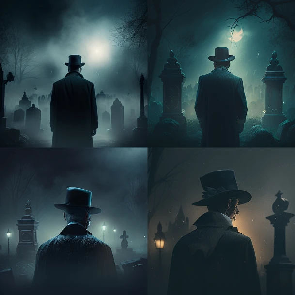 A mysterious man, wearing a full dark hat. His attire is a black suit with a white tie. In a cemetery scenario with a lot of fog on a very dark night, with a full moon. Soft lighting, extremely realistic, menacing, photorealistic painting, sharp focus, 8k, perfect composition.