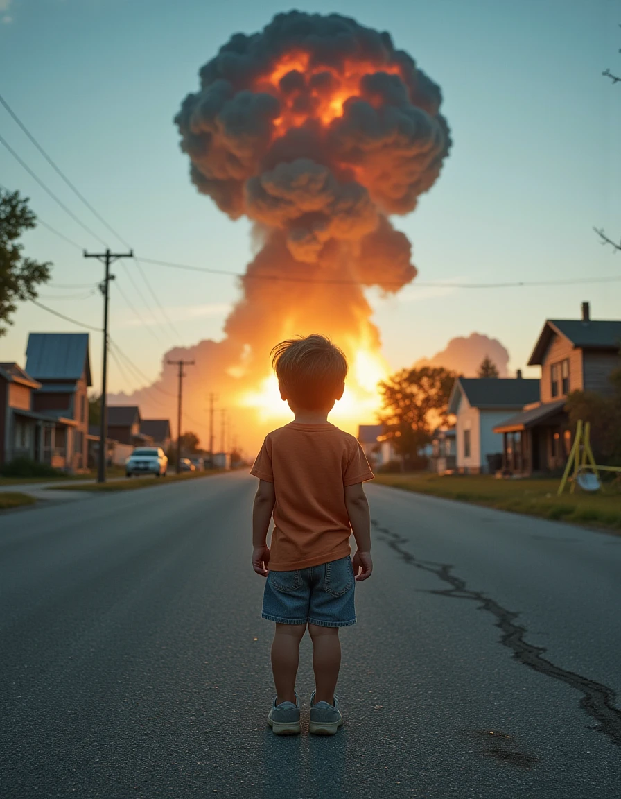 A contemporary, hyper-realistic color photograph capturing a heart-stopping moment in a small, quiet Midwestern town. The camera angle is positioned from behind a small child, around 6 years old, standing alone on a deserted street. The child is dressed in simple summer clothing, their small frame contrasting starkly against the vast, open space. The background is dominated by a massive, towering nuclear explosion mushroom cloud rising ominously on the horizon, captured in sharp focus. (((a giant atomic test explosion mushroom cloud:1.9) ))