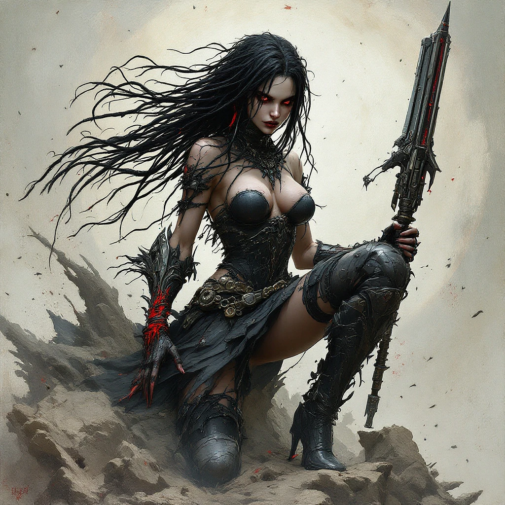 Female vampire chaos space marine, holding a weapon, long black dreads, in the style of gritty horror comics, 19th century German realism, spiky mounds, frenzied action painting, mixed media chaos --chaos 25 --ar 4:5 --stylize 300 --v 6