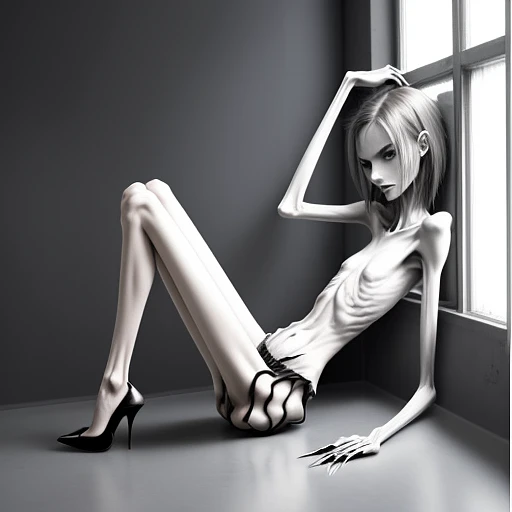 lying position of extreme skinny slender anorexic girl very skinny slender girl, with long curved claws, skinny legs and long skinny calves in high heels ,