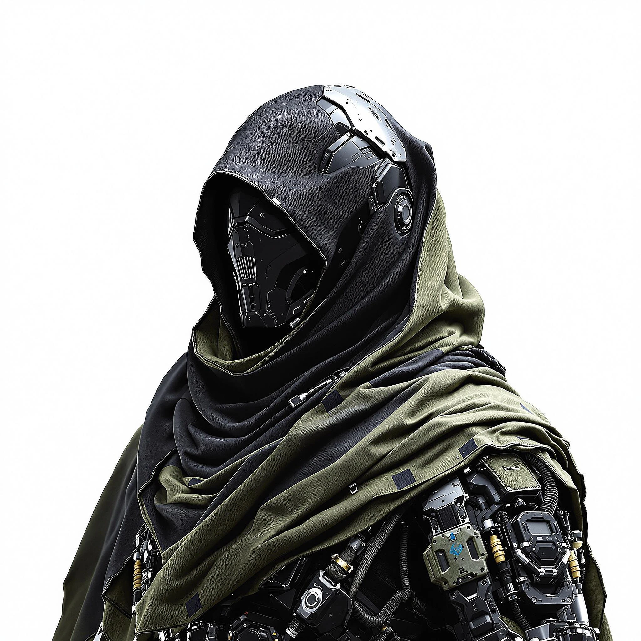 Photo-realistic, Hyper-Detailed, black ops, middle eastern cyborg infused human warriors, armor is infused with electronics, large black and army green Shermag draped over head like hood and wrapped around neck. Post apocalyptic dystopia Side angle camera shot. Bright white studio background with effective lighting for shadows , full side shot