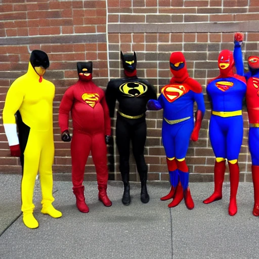5 black man in different superhero costumes, one in a red and blue superman suit superhero, the other in a black batman suit, one in a green ninja suit, the other in a red bat suit and the member in a yellow ninja suit , al of which are wearing gold gloves and yellow boots, black sunglasses with a red ski mask and holding two spraycans in front of a black wall with graffiti with the word ZOZ that are engaged with five women, wearing black and pink cats suits seducing the superheroes