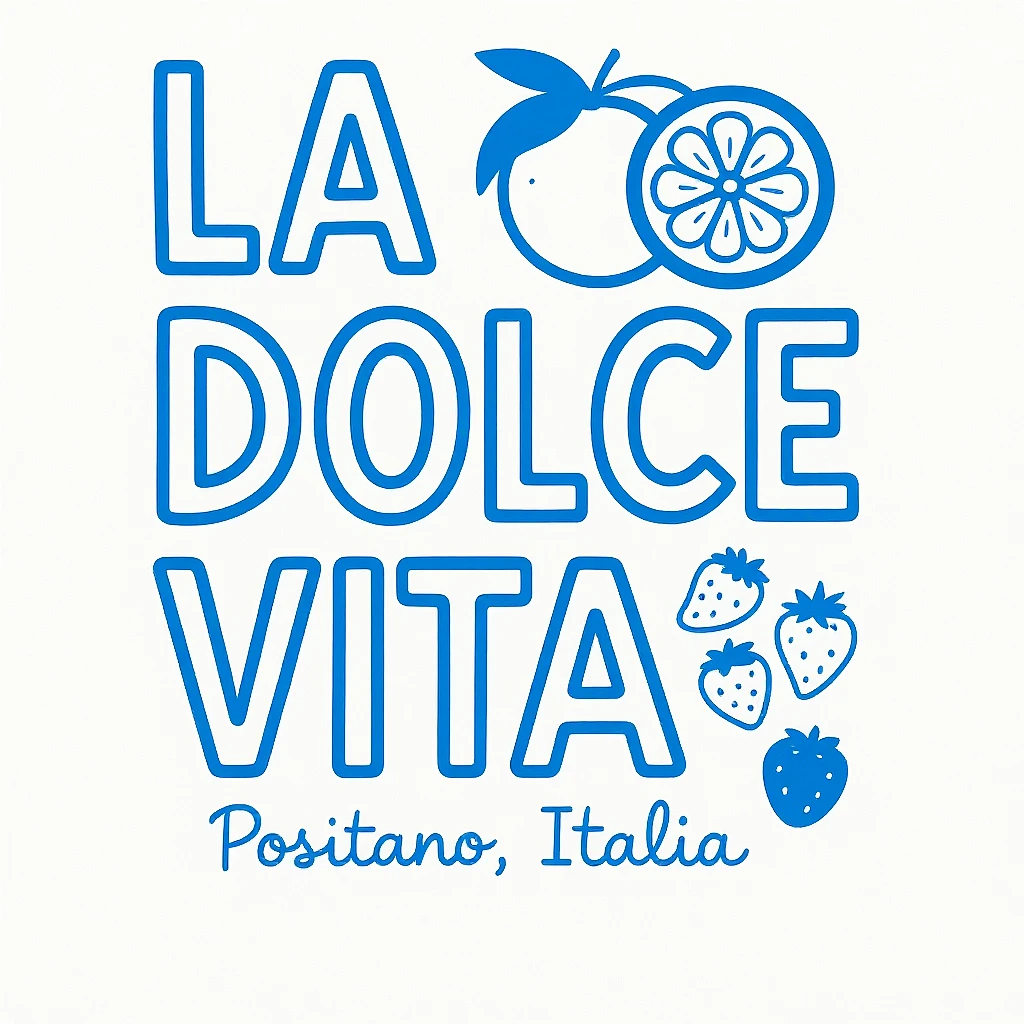 A bright and cheerful digital illustration with a Mediterranean summer theme, featuring the phrase “LA DOLCE VITA” in bold, playful blue lettering. Above the text is an illustration of a whole orange and a sliced citrus fruit, and below are clusters of strawberries and blueberries in a matching blue outline style. At the bottom of the design, the handwritten phrase “Positano, Italia” is added in a charming cursive script. The entire composition is centered on a clean white background, giving it a fresh and vibrant look perfect for summer apparel, travel-themed prints, or fruity stickers. Sized 1024x1024 pixels.