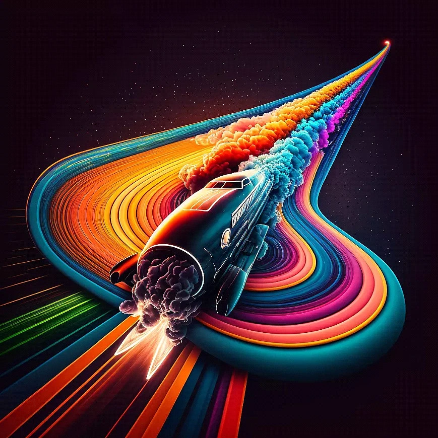 rocket ship, speed of light, hyperdrive::5 vibrant, neon, extreme rainbow stream::4 illuminated, intricate detail, cinematic lighting::1