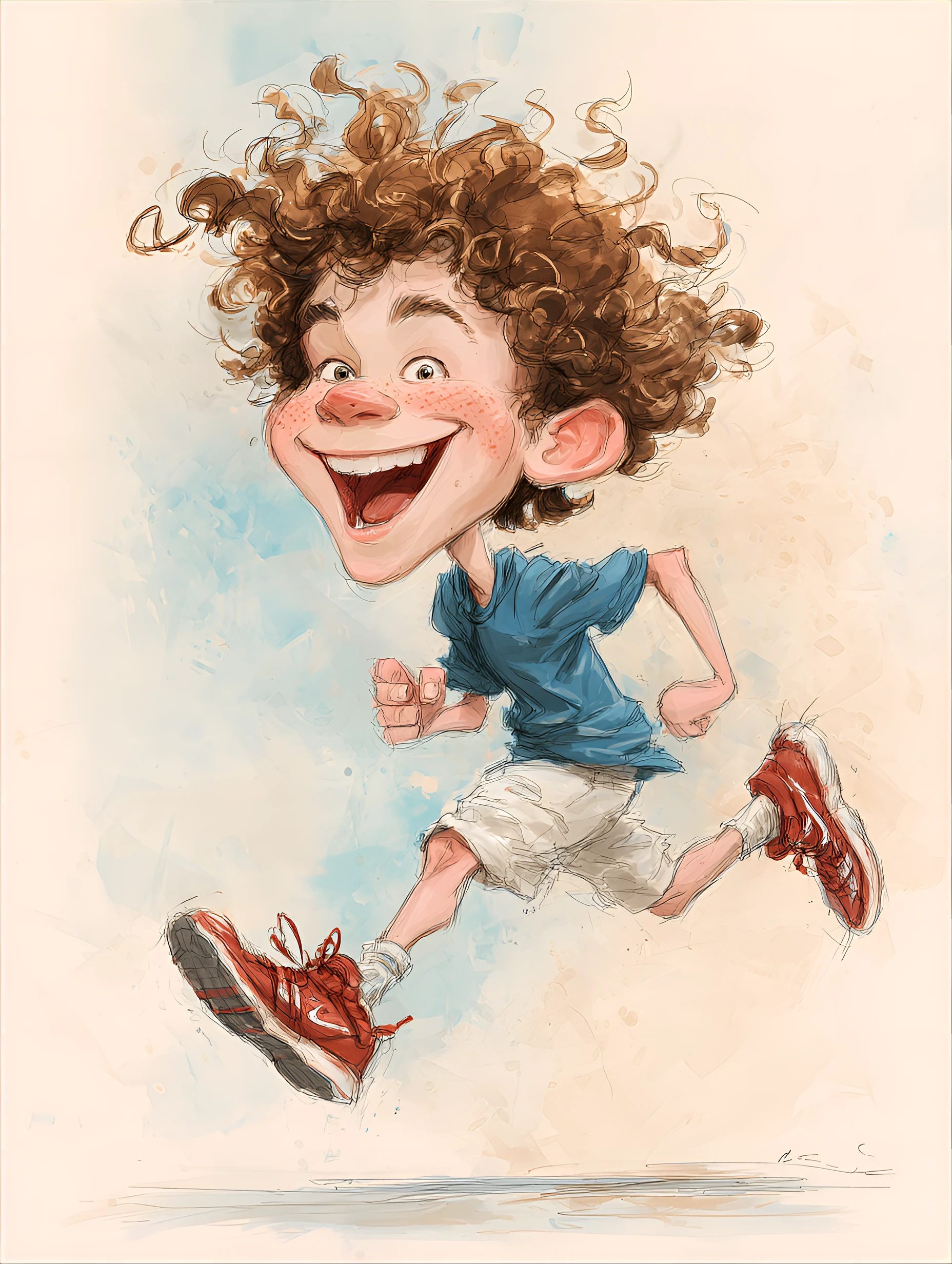 funny caricature, energetic boy caricature, juvenile cheerful male, 7 years old, curly hair, freckled face, lanky, big head, exaggerated caricature features, laughing expression, wearing blue shirt, white shorts, red sneakers, jumping pose, vibrant watercolor style with fluid lines, dynamic, joyful