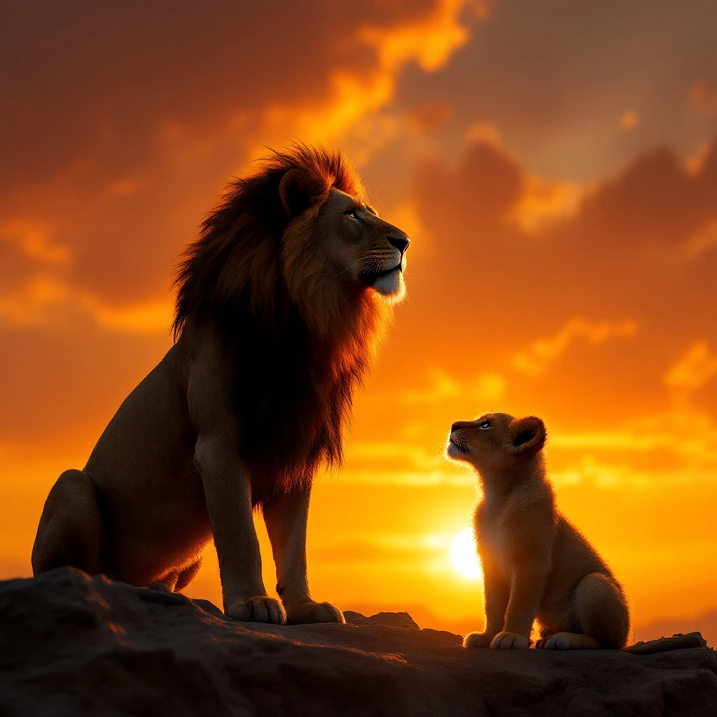 A powerful and emotional scene of a lion and a lion cub standing side by side on a rocky ledge, bathed in the warm golden light of a sunset. The large lion stands tall and proud, gazing into the distance, while the young cub looks up at him with admiration and trust. The sky is ablaze with vibrant orange and yellow hues, casting a serene glow over the duo. The silhouette of the lion and cub against the fiery sky evokes a deep sense of love, mentorship, and an unbreakable bond. The scene captures the essence of strength, protection, and the timeless connection between parent and child. " Optional Style: "Epic, cinematic, emotional, with soft lighting and a warm color palette.
