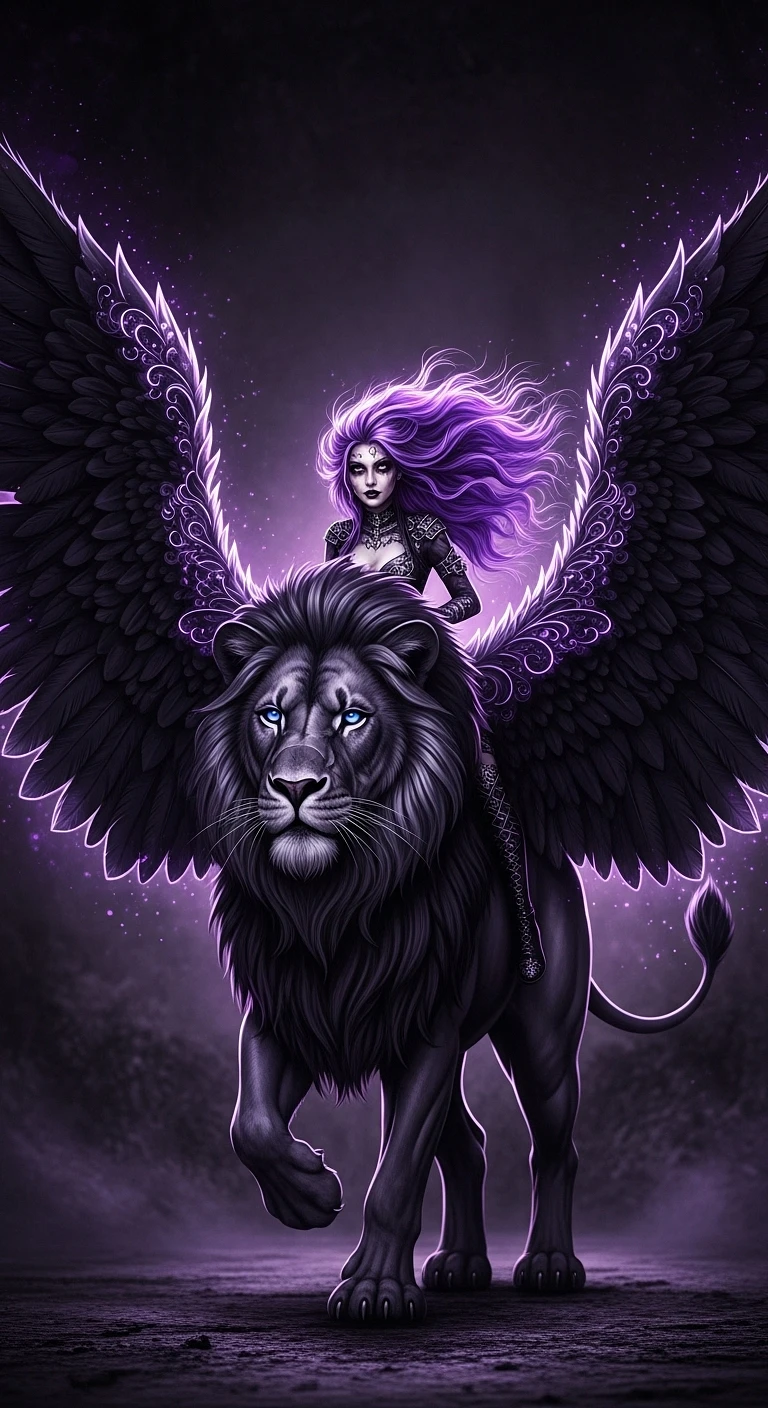 A full body photo shot of an angelic mythical black lion with large black outstretched feathery wings with glowing intricate detail, and a gothic-style female with long flowing purple hair and dark bold makeup riding on its back. Dark, gritty textured background. Symetrical hyperdetailed texture, pearl filigree, deep violet, concept art, DeviantArt, perfect composition, masterpiece, glittering, professional photography, macro, natural lighting, canon lens, 8k, sharp focus, ethereal