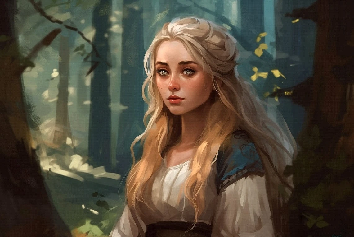 character concept, pretty blonde princess in the woods, dungeon and dragons, fantasy, medieval --v 5 --ar 3:2