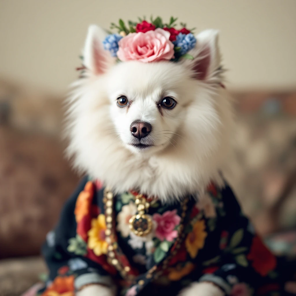 A dog dressed up as Frida Kahlo, white Japanese Spitz, with flowers on its head, which is a recreation of the real character. --ar 26:37 --v 5. 2