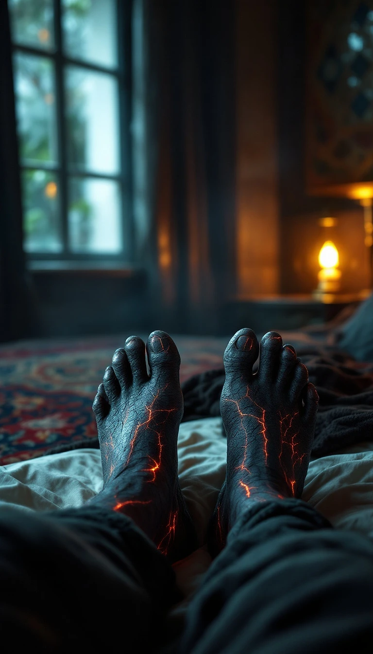 POV first-person, I am a jinn, lying on my bed. Only my feet are visible. My feet rest at the edge of the bed, unnatural in shape—twisted, inhuman. They are more like cloven hooves, resembling those of a goat or a ram, with a rough, dark texture. The thick, calloused skin appears cracked in places, as if aged by time itself. A faint, eerie glow pulses beneath the surface, trailing through the veins like ember lines in burnt wood. My toes don’t exist in the human sense—split into two sharp, curved sections, hard like worn stone. The room is a blend of modern Iranian design and an ancient, mystical presence. A Persian rug, richly patterned, stretches across the wooden floor. A brass lamp flickers dimly, its glow reflecting off decorative ceramic tiles embedded in the walls. A heavy, dark-colored blanket covers most of the bed, but even its warmth cannot mask the unnatural coldness radiating from my own body. The air is still, yet something unseen stirs in the shadows, making the atmosphere feel both familiar and unsettling.