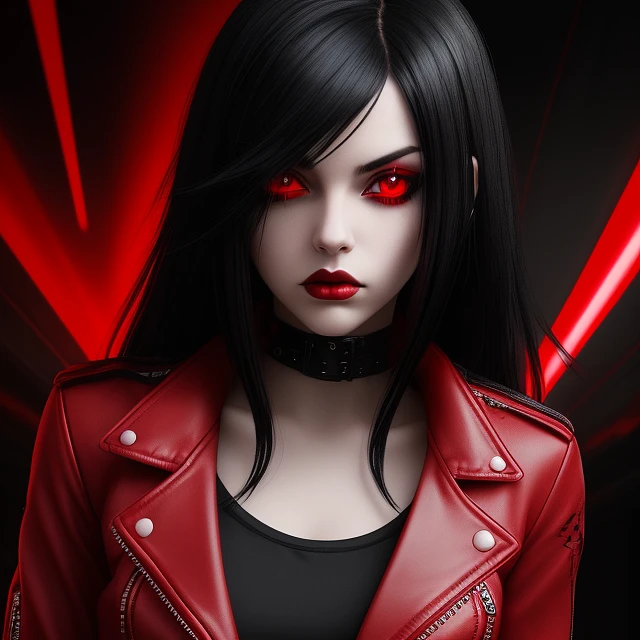 emo girl. red leather jacket with black trim. glowing red iris. blak black hair with red highlights. red aura effect.