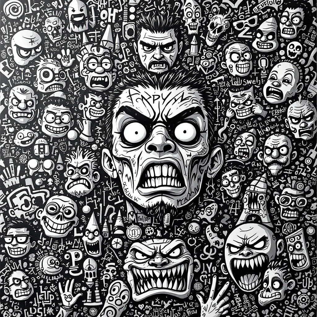 An intricate and mainly black and white graffiti-style poster featuring various elements, such as cartoon characters, symbols of urban culture, and dynamic expressions, focusing on faces --ar 63:128 --stylize 750