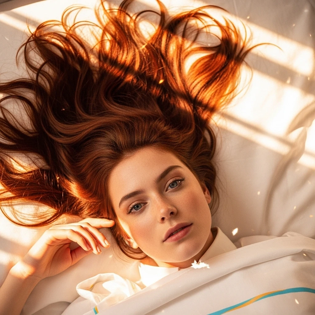 an attractive young woman with blue eyes lying face down on the bed, in the style of animated gifs, light white and light amber, jagged edges, the snapshot aesthetic, timeless beauty, goosepunk, sunrays shine upon it --no freckles --chaos 65 --ar 1:2 --profile yruxpc2 --stylize 750 --v 6. 1