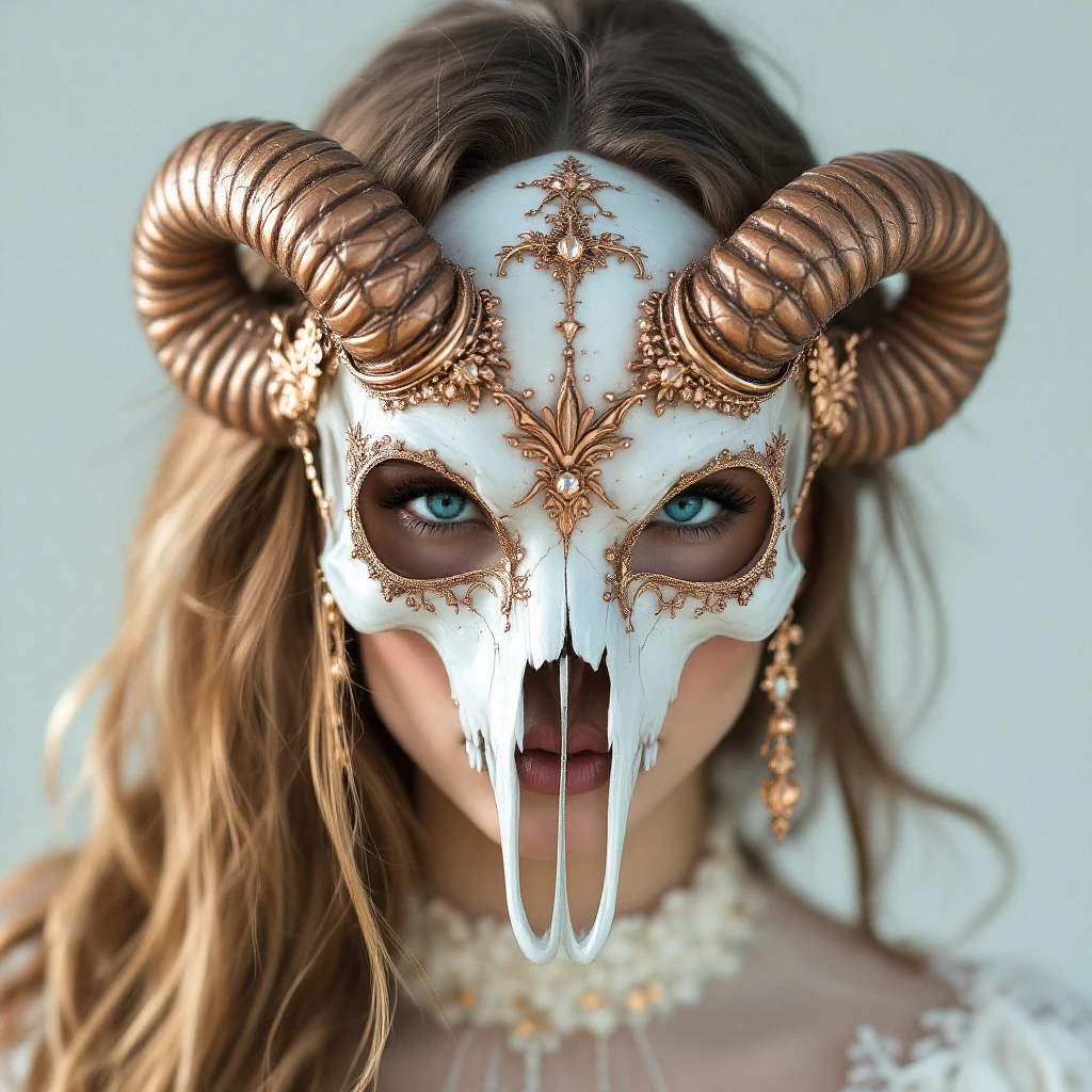 photo portrait of a woman wearing a delicate horned skull mask, in the style of rose gold and white, blue eyes, looking at camera, frontal vogue style, dreamy symbolism, celestialpunk, celtic-inspired details, fashion editorial, canon 50mm 1. 2L, ultra details